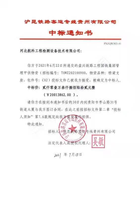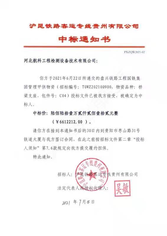 近日,航科公司收到滬昆鐵路客運(yùn)專線貴州有限公司中標(biāo)通知書,中標(biāo)金額近660萬元和2000萬元。
