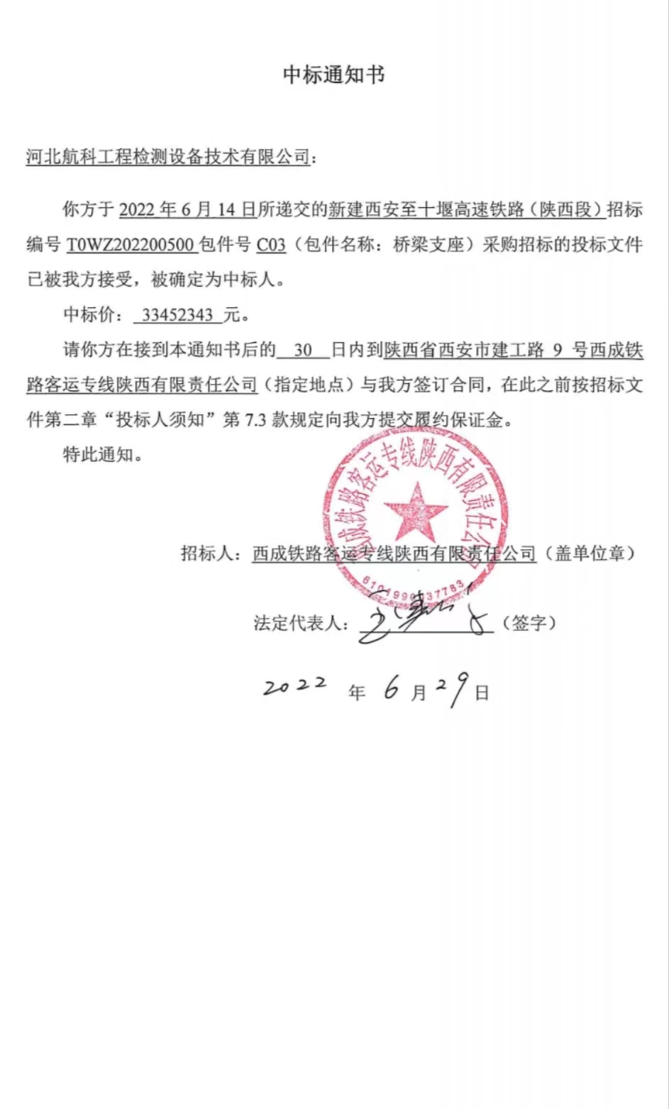 近日,我公司收到西成鐵路客運(yùn)專(zhuān)線陜西有限責(zé)任公司中標(biāo)通知書(shū),中標(biāo)金額3345.2343萬(wàn)元! 我公司將不負(fù)信任,再接再厲,嚴(yán)控產(chǎn)品質(zhì)量,保證按時(shí)交貨。